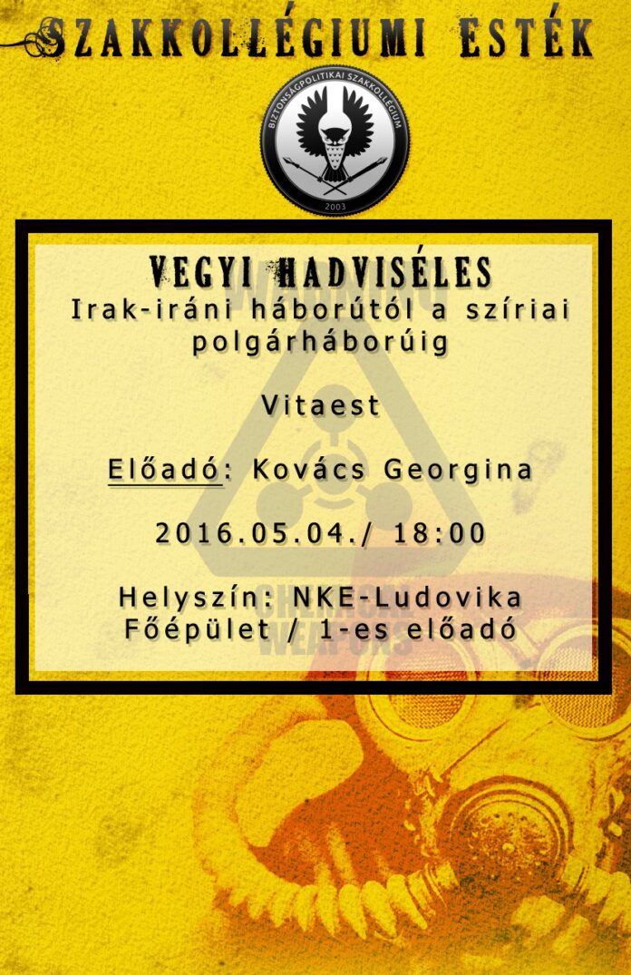 A Biztonságpolitikai Szakkollégium meghív minden kedves érdeklődőt a Szakkollégiumi Esték soron következő alkalmára, ahol a vegyi hadviselés kérdéseit fogjuk megvitatni.