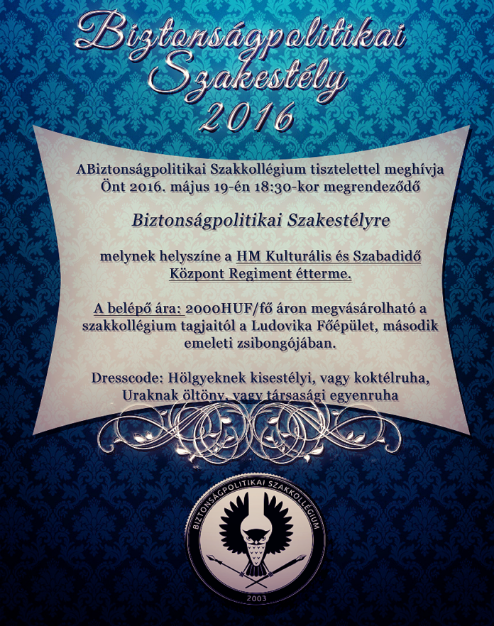 A Biztonságpolitikai Szakkollégium idén is megrendezi az immár hagyománnyá vált BIZTONSÁGPOLITIKAI SZAKESTÉLYT, amelynek időpontja 2016. május 19., csütörtök, 18:30 óra. Helyszíne a Honvéd Kulturális Központ Regiment Étterme (1143 Budapest, Stefánia út 34-36.)