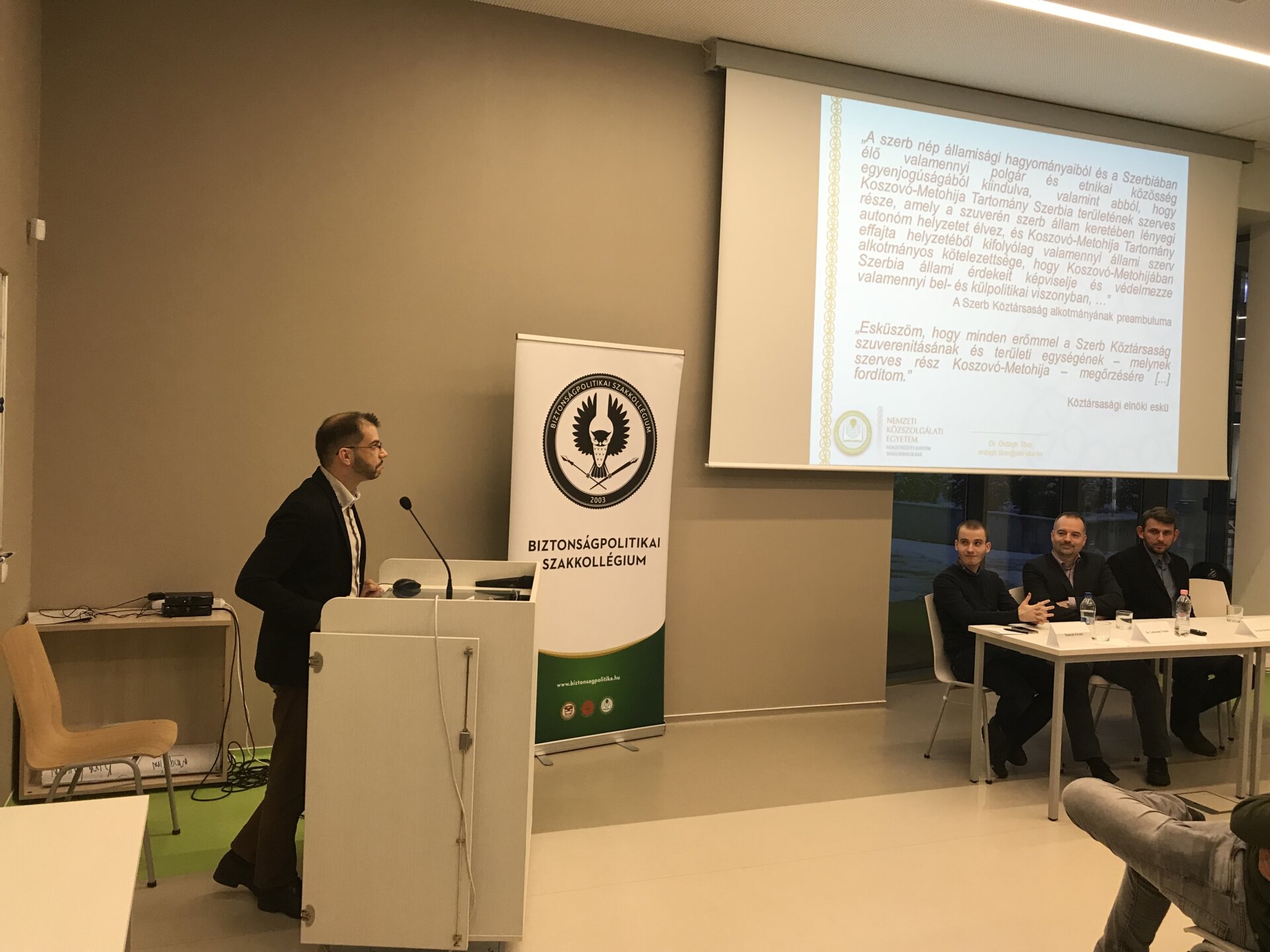 2018. február 20-án megrendezésre került Koszovó: mérlegen az első tíz év elnevezésű konferencia a Biztonságpolitikai Szakkollégium szervezésében a Nemzeti Közszolgálati Egyetem Orczy Úti Kollégiumában. Három előadónk három aspektusból vizsgálta a kérdést: Dr. Lattman Tamás, nemzetközi jogász (IIR Prague/NKE), aki jogi szempontból elemezte a helyzetet; Kovács Károly főhadnagy, a Magyar Honvédség Civil-katonai és Lélektani Műveleti Központ beosztott tisztje, aki katonai aspektusból; és Dr. Ördögh Tibor, Balkán-kutató (NKE), aki pedig leginkább politikai szempontból ismertette és elemezte az elmúlt időszakot Koszovó vonatkozásában.